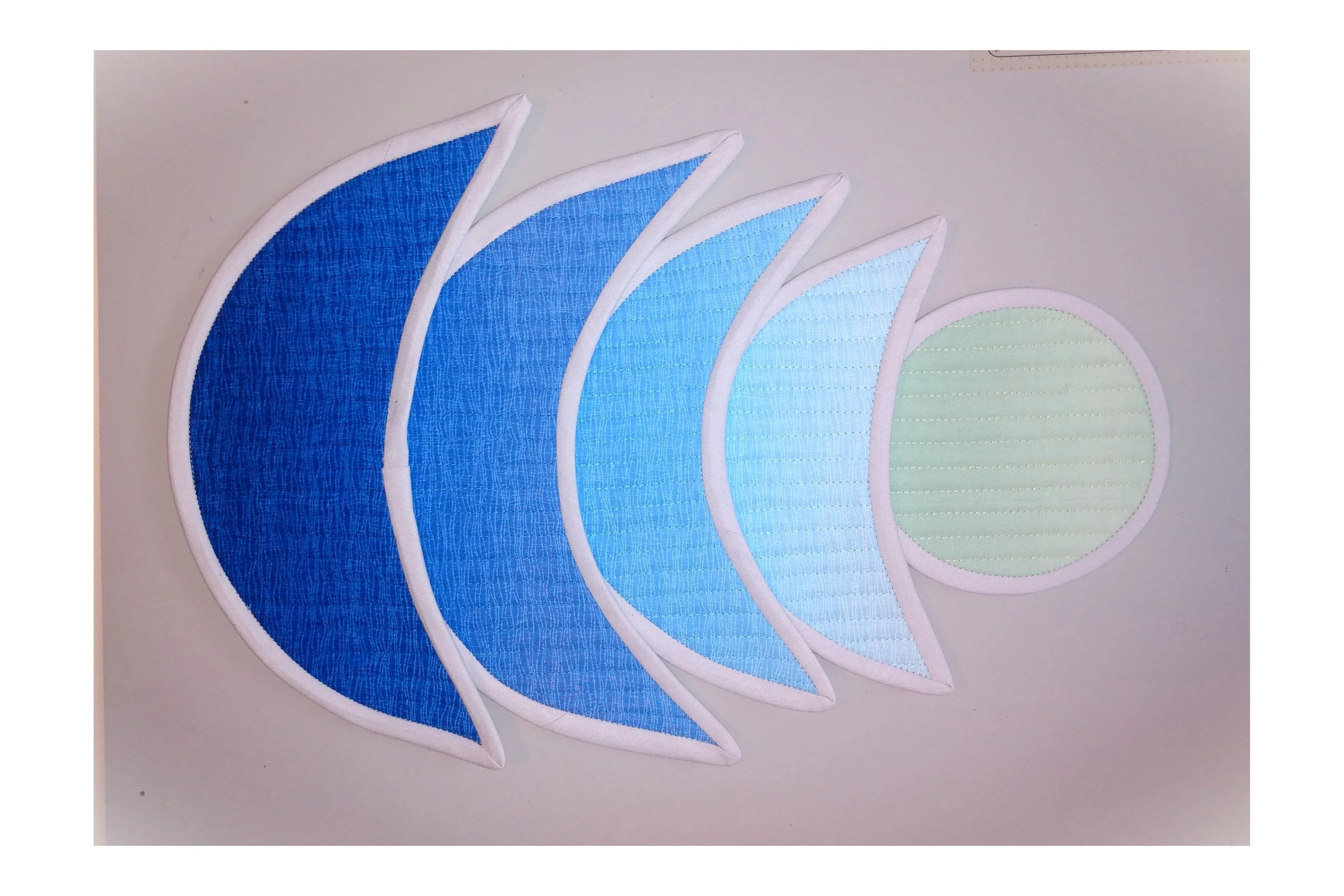 Peaks shows off the angular momentum of the half rectangle triangle shape. Ombre prints create the illusion of depth and space, and the angled quilting moves the eye around the image. Shapes emerge from the background to shimmer, then fade to background. The design is deliberately formal to emphasize the beauty of the pure geometry, while the matchstick quilting makes it soft and touchable.